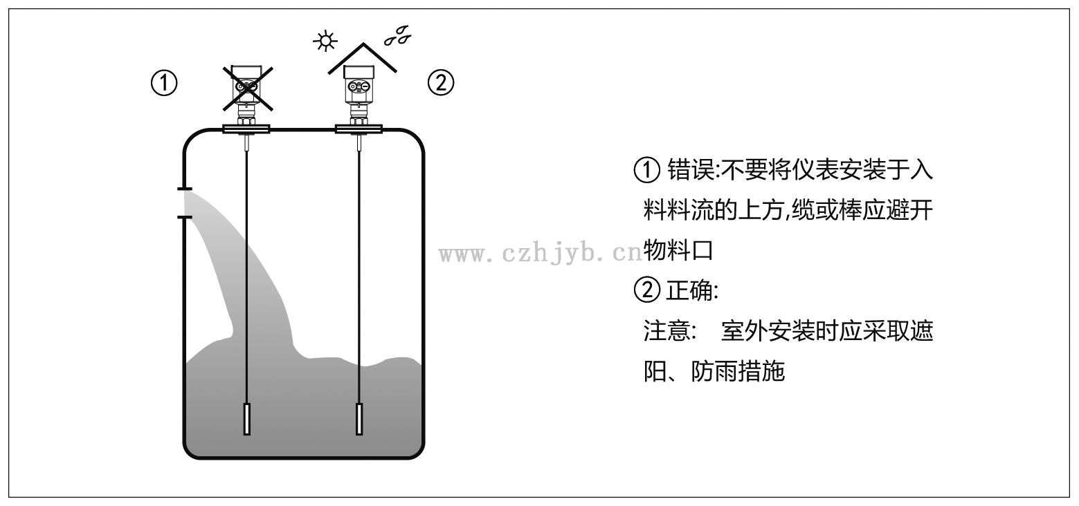 在整個量程范圍內確定纜或棒不要接觸到內部障礙物,因此安裝時應盡可能避開罐內設施,如:人梯、限位開關、加熱設備、支架等。另外需注意纜或棒不得與加料料流相交。