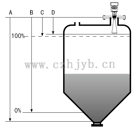 注:使用雷達(dá)物位計時,務(wù)必保證最高料位不能進入測量盲區(qū)(圖中D所示區(qū)域)。